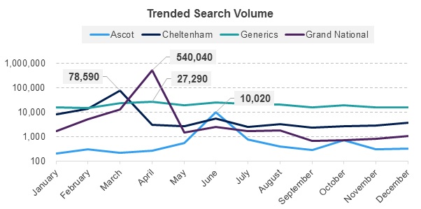 Over the course of the year, the search volume for generic racing betting keywords peaks at just over 27,000 in the month of March. However, that peak is dwarfed by the event specific keyword searches that take place around Cheltenham and the National. Cheltenham related searches peak at close to 80,000 in the month of April, while more than 540,000 searches take place in April alone for Grand National related terms.