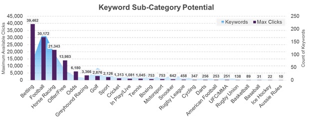 Keywords within the ‘betting’ category (for example, “betting”, “online betting” and “sports betting”) naturally command the highest volumes of traffic, but these keywords are both few and far between, and highly competitive. While keywords in the ‘football’ category generate slightly less traffic, this is driven by a significantly greater number of keywords, and this is one example of where Oddschecker is using events and competitions to drive its visibility.