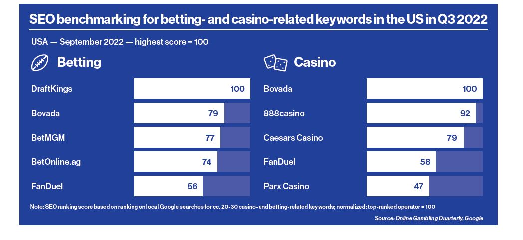 In the US in Q3 2022, the SEO analysis included 31 betting-related keywords and 21 casino-related keywords. (The full list is available from the OGQ.)