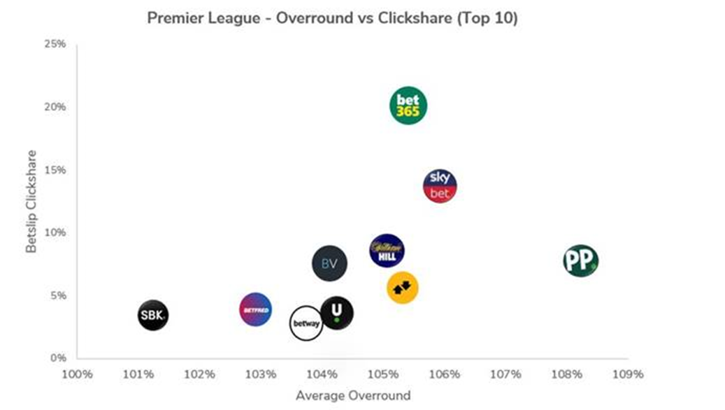The largest share of clicks was achieved by bet365 (20.5%), which offered an average overround of 105.4% on its standard 1×2 market (that’s the 16th best-priced odds of the 20 sportsbooks on the oddschecker grid). Moreover, Paddy Power ranked 4th for clickshare (8.0%) whilst offering the widest-ever average monthly overround on record (108.3%).