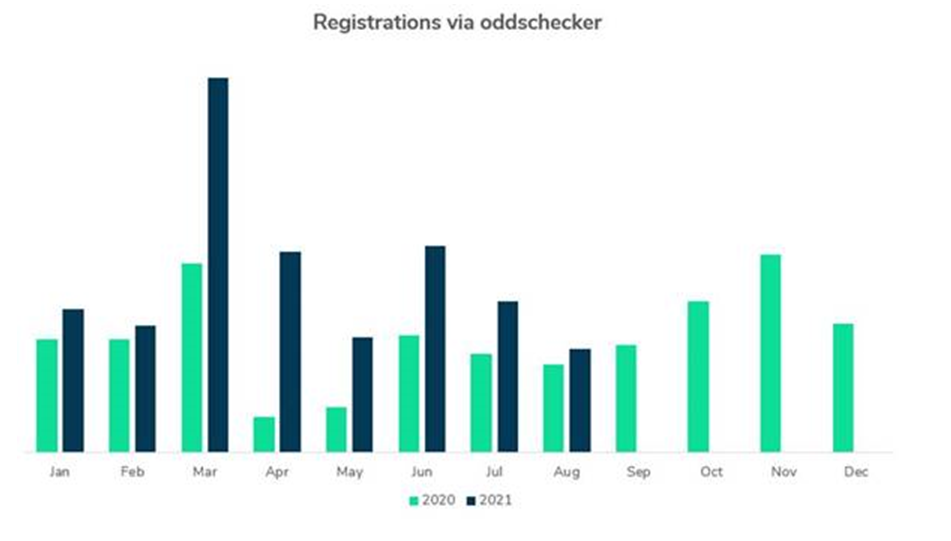 Last month, registrations via oddschecker were up +17% vs August 2020. This means that every month this year so far has seen an increase in acquisition delivery versus the equivalent month in 2020.