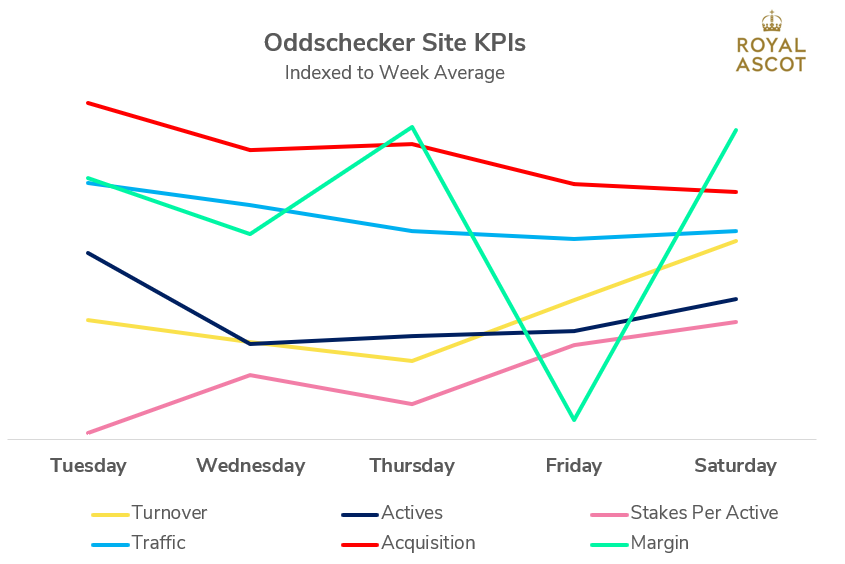 Oddschecker’s latest data focusing on the month of June highlights Royal Ascot and the US Open golf. Punters were keen to get involved in the action at the prominent British racecourse and acquisition from the price comparison site understandably peaked on the first day of the festival. As acquisition declined through the week, turnover spiked as the curtain came down while stakes per actives increased with the firm explaining that they grew “as a result of recycling and the weekend impact”. Margin was up and down over the course of the week with bookies being battered on the Friday of the festival. A number of short priced winners on the penultimate day was a boon for punters with one customer at William Hill bagging £300,000 after going through the card.
