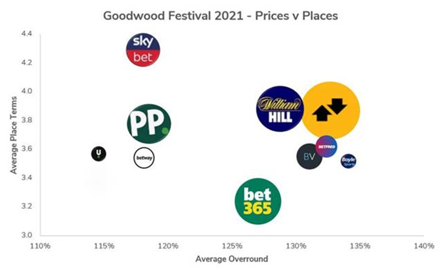 On the oddschecker grids, Sky Bet differentiated itself from the rest by offering the most place terms on average (4.3) while also remaining competitive on price (an average overround of 117% across all the races at the festival).