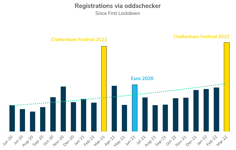 Boosted by horseracing’s Cheltenham Festival, oddschecker saw a record number of partner registrations in the month of March. The odds comparison site reported that the 2022 edition of the Cheltenham Festival “will go down in the history books as oddschecker’s greatest-ever month from an acquisition point of view”. The number of registrations with partners outperformed its previous best month (March 2021) by 5% and almost doubled the number of its now-third best month (June 2021).