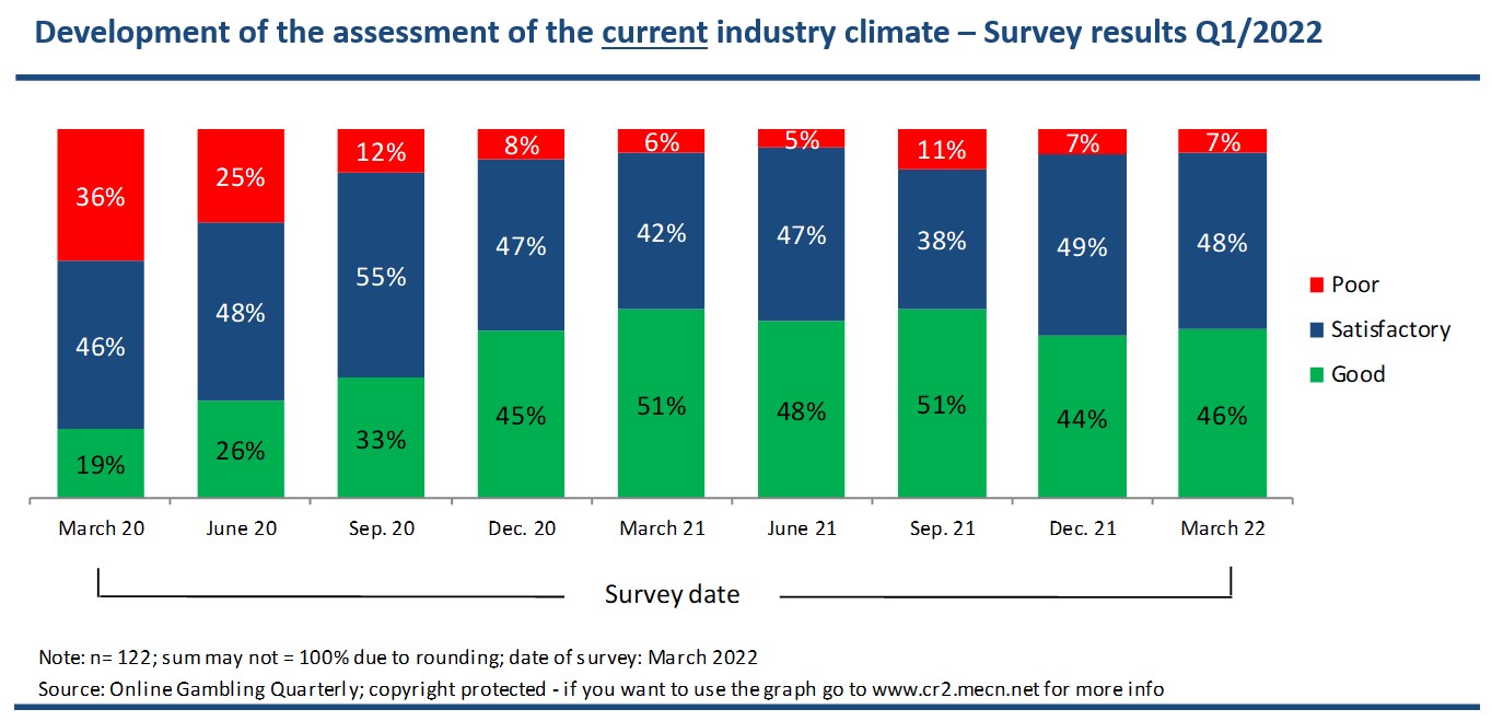 The Online Gambling Quarterly analysts asked industry experts to assess the current business situation and their expectations for the next 12 months. For the current edition, they gathered the estimates and insights of 122 market insiders and experts, including many C-level executives. With regular updates, this survey and its results serve as an industry barometer for the overall online gambling industry climate. Fifty-four percent of the surveyed experts and market insiders assess the current business climate of the online gambling industry as “satisfactory” or even “poor”. Of those surveyed, 46% of the experts consider the current climate as “good”. From June 2020 to March 2021, we saw a continuous improvement of the business climate. But in the summer and autumn of 2021 that upward trend came to a halt, and after a relatively steady phase, we are now seeing a slow downward turn.