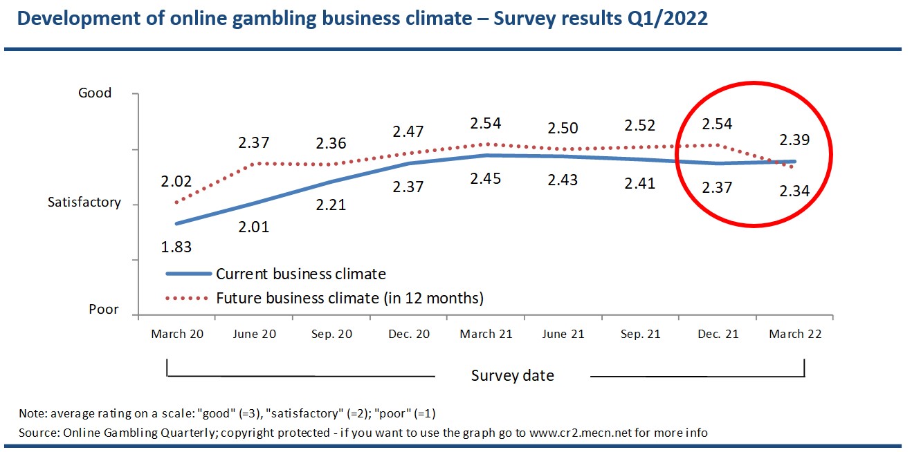 The Online Gambling Quarterly analysts asked industry experts to assess the current business situation and their expectations for the next 12 months. The assessment of the future business climate (in 12 months) saw a relevant drop. The current conflicts in Eastern Europe, growing inflation and the ever-increasing regulations seem to give the estimates a considerable setback.