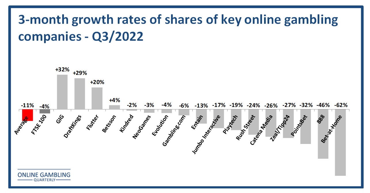 Again a tough quarter for online gambling shares and a bit “tougher” than for other tech stocks (Nasdaq down -5% in Q3). Below are the key results of the analyses – find here more insights:- “Winner” – The biggest leap in the sample of online gambling-focused companies was taken by GiG with an increase of +32% over the past three months; followed by DraftKings (+29%).
