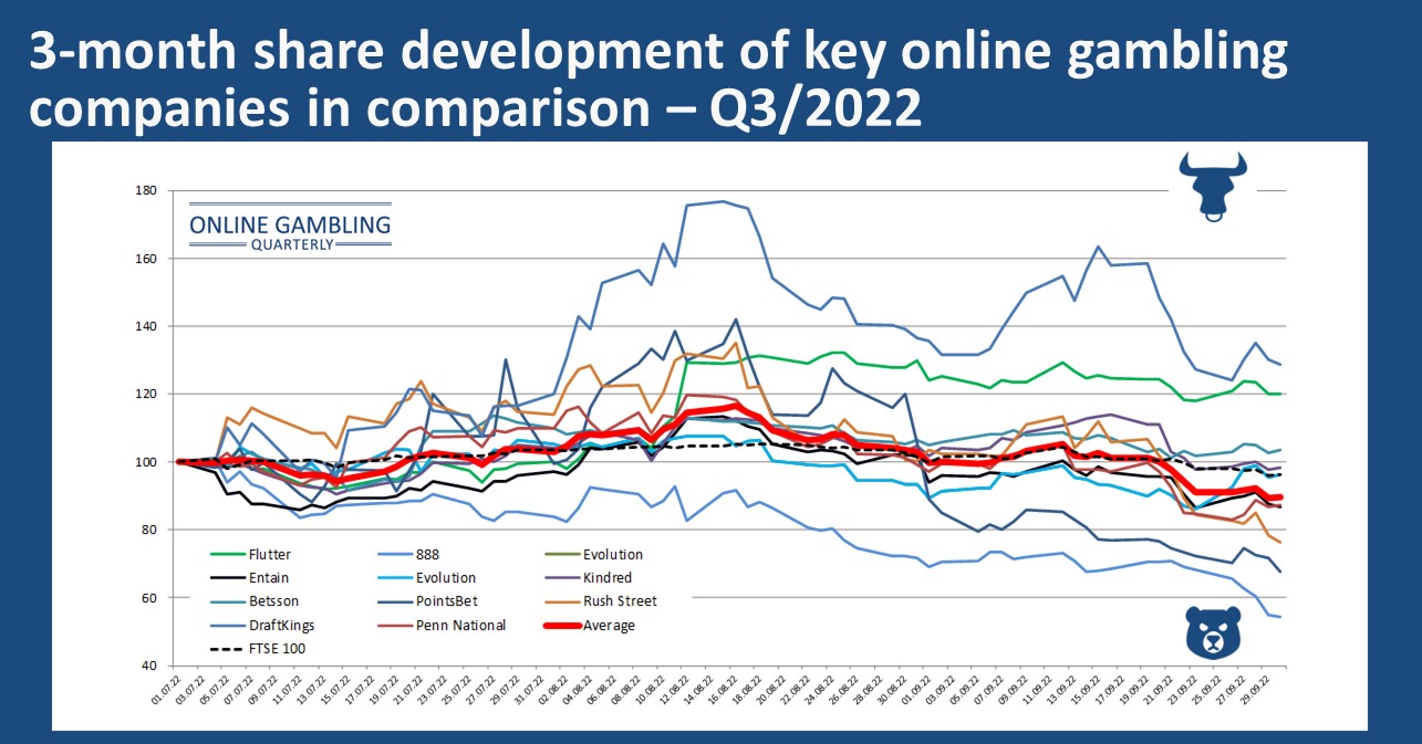 - Comparison to FTSE 100 – Compared to the three-month development of the FTSE 100 (-4%), the average growth of the online gambling industry looks “worse”.