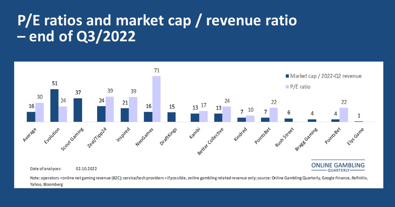 The Online Gambling Quarterly also analysed the current P/E ratios for several companies. The ratio provides a good picture of the value of the company.- NeoGames has the highest P/E ratio – NeoGames leads the ranking with a P/E ratio of 71.