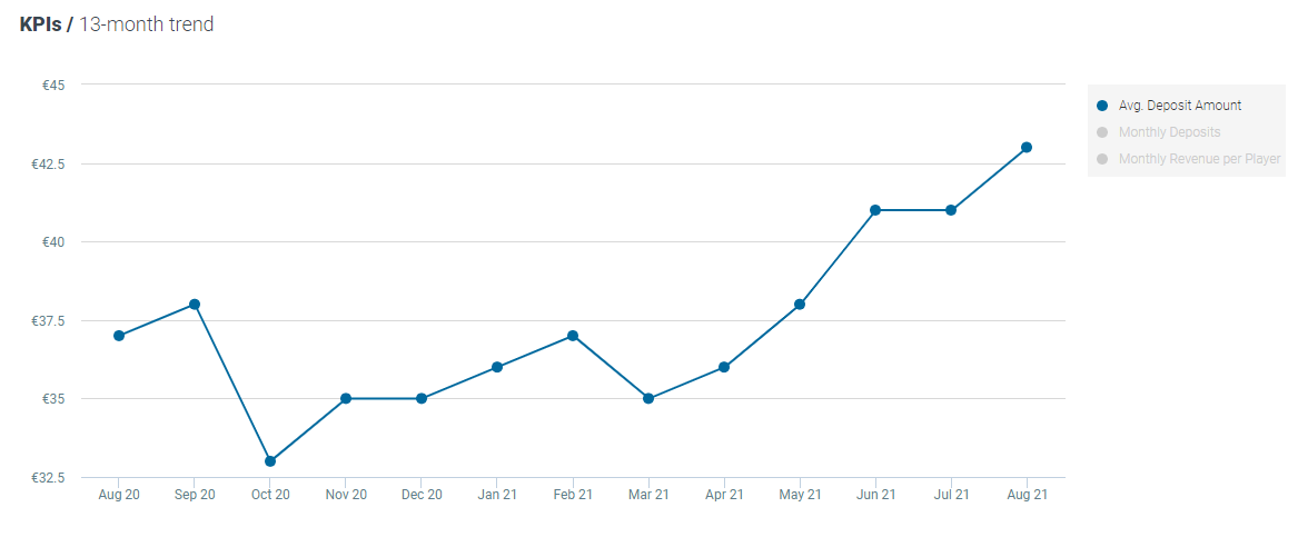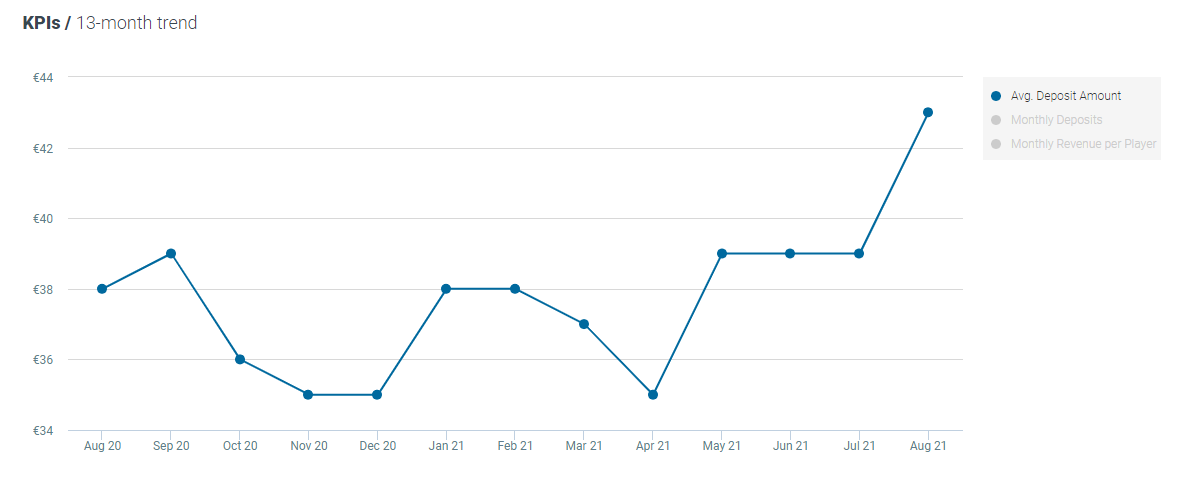The average deposit amount for casino players increased by 10% MoM and by 13% YoY, now standing at €43.