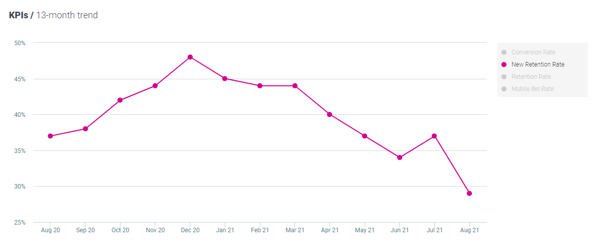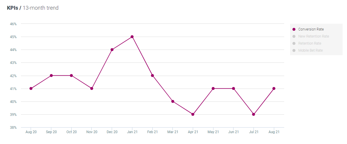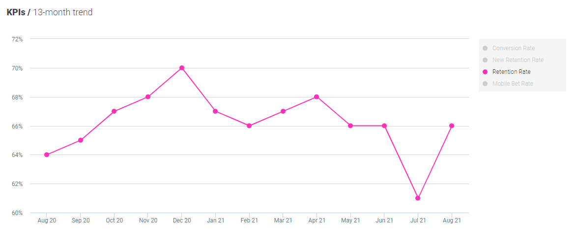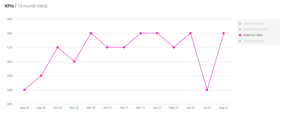 For this report, this KPI is defined as the total mobile bet amount during August, divided by the total bet amount. Looking at the data, the rate decreased by 1% MoM and increased by 6% YoY, now standing at 69%.