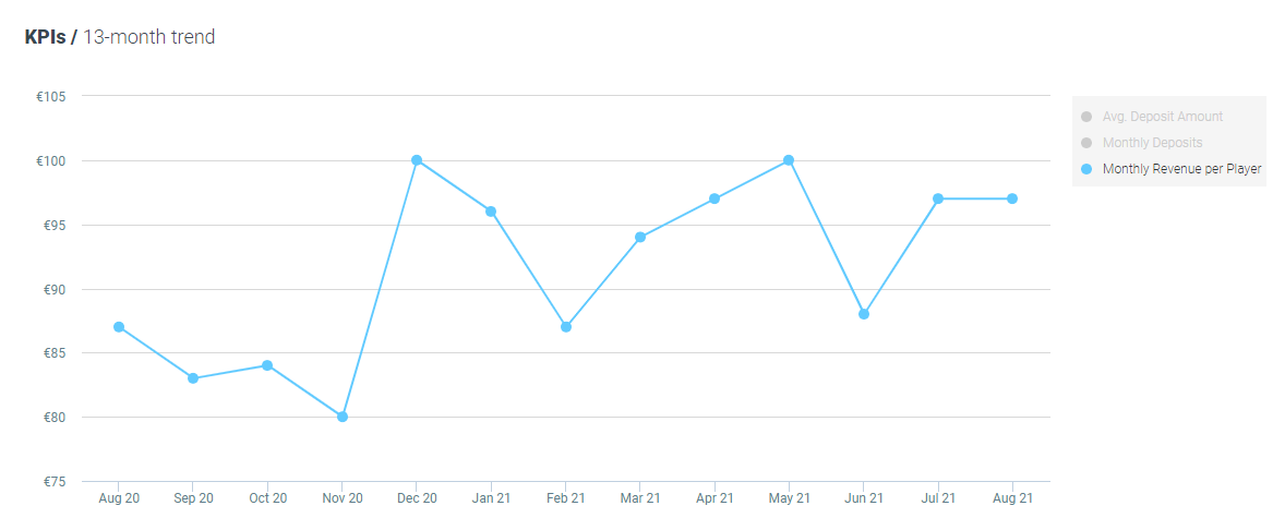 There has been a decrease of 1% MoM in average revenue per active player and an increase of 13% YoY, now standing at €89 per player.
