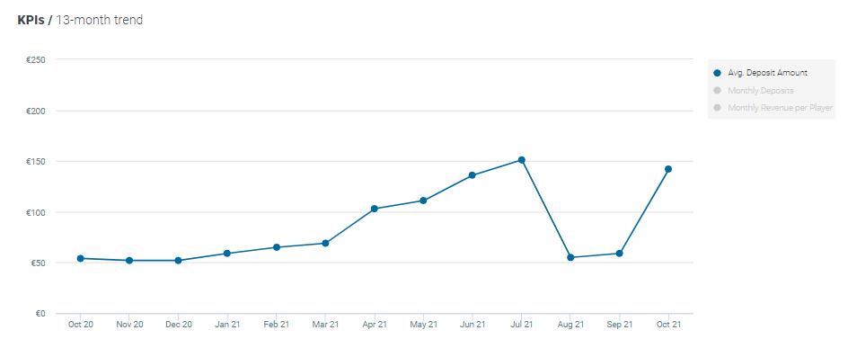 The French don’t usually do things half-heartedly. They’re unique, they know it and when they go in, they’re all-in. Looking at the October data, one figure stood out – the French are back with a whopping €142 average deposit compared to the overall average of just €40. They do it in just 5.7 monthly deposits, which is lower than the overall average of 9.9. That brings their average deposit to €25 compared to €4.4 overall. “Fine,” you may say, “but Spain, UK, and Italy are no different.” To which we’d reply, “not true, they averaged a monthly spend of €51, €57 and €39 respectively. Ireland comes close, but not really, with €118”. And sure, you could still argue, “looking at the graph below, the French averaged €150 in July. So there,” to which we’ll retort, “Yes, but in October there were no Olympics and/or Euro tournament”. Lastly, when we looked at the October 2020 figure for some comfort, we found it stood at €54 (still above the current average), of course, that was at the height of the pandemic, but still, something is going on here. As the French break away from the rest of the continent (Frexit, if you will) and go all-in, we’ll definitely keep an eye out for this one.