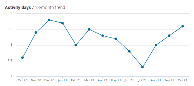 This month, the number of activity days increased by 4% MoM and by 13% YoY, now standing at 8.6.