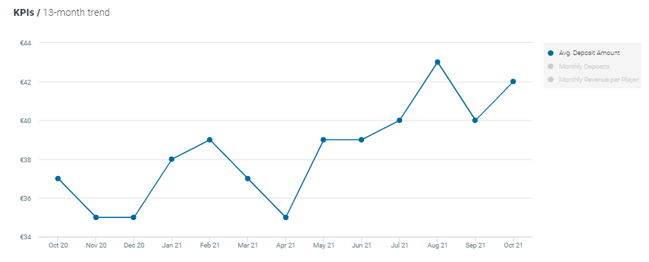 The average deposit amount for casino players increased by 5% MoM and increased by 14% YoY, now standing at €42.