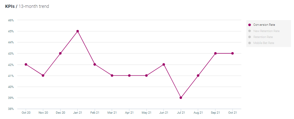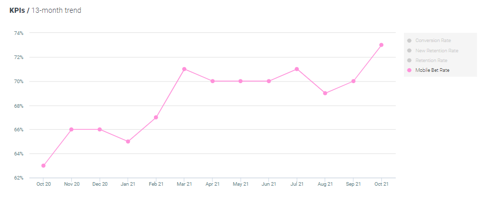For this report, this KPI is defined as the total mobile bet amount during September, divided by the total bet amount. Looking at the data, the rate increased by 4% MoM and increased by 16% YoY, now standing at 73%.