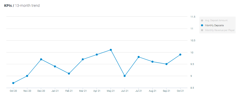 The average number of monthly deposits for sports bettors increased by 4% MoM and increased by 14% YoY, now standing at 9.9 monthly deposits per player.