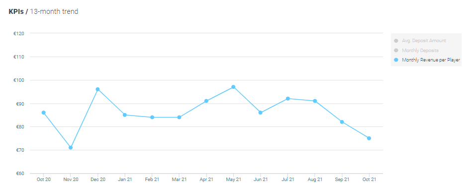 There has been a decrease of 9% MoM in average revenue per active player and a decrease of 13% YoY, now standing at €75 per player.