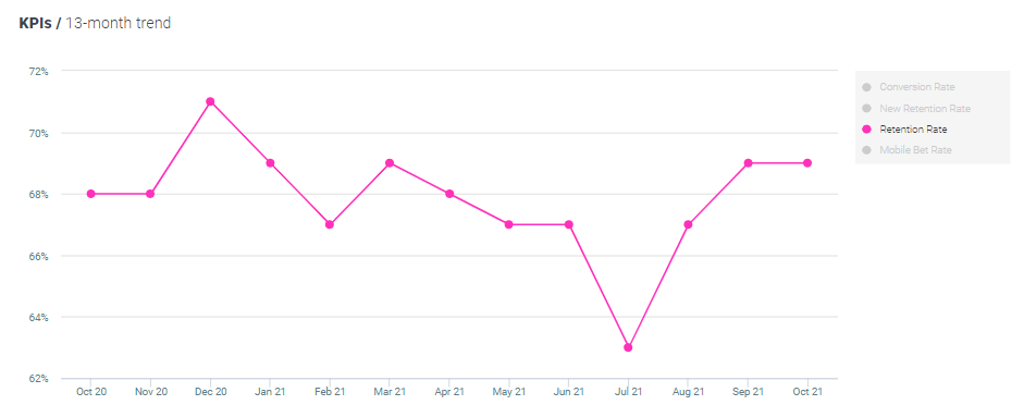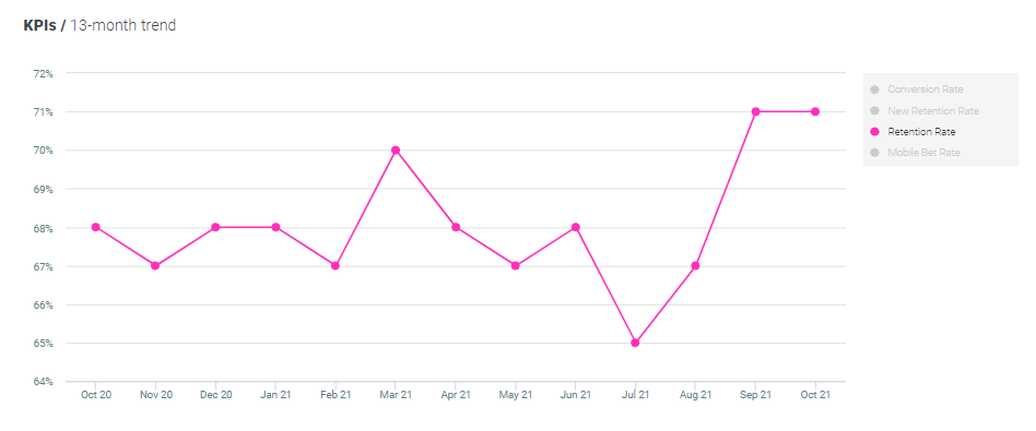 Retention rates for sports bettors have remained the same MoM and increased by 1% YoY, now standing at 69%.