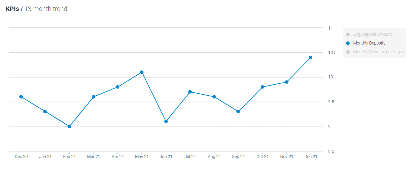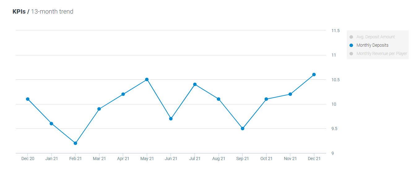 The average number of monthly deposits per player increased by 5% MoM and 4% YoY, now standing at 10.6 deposits per player.