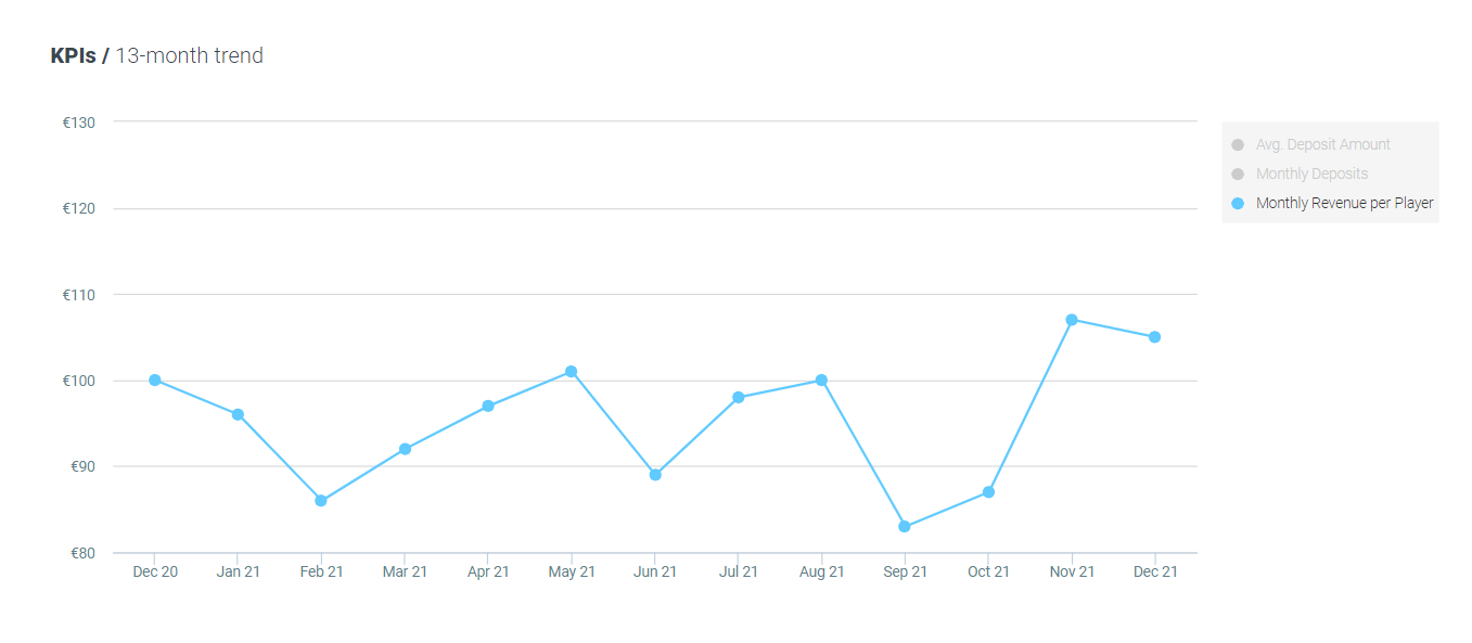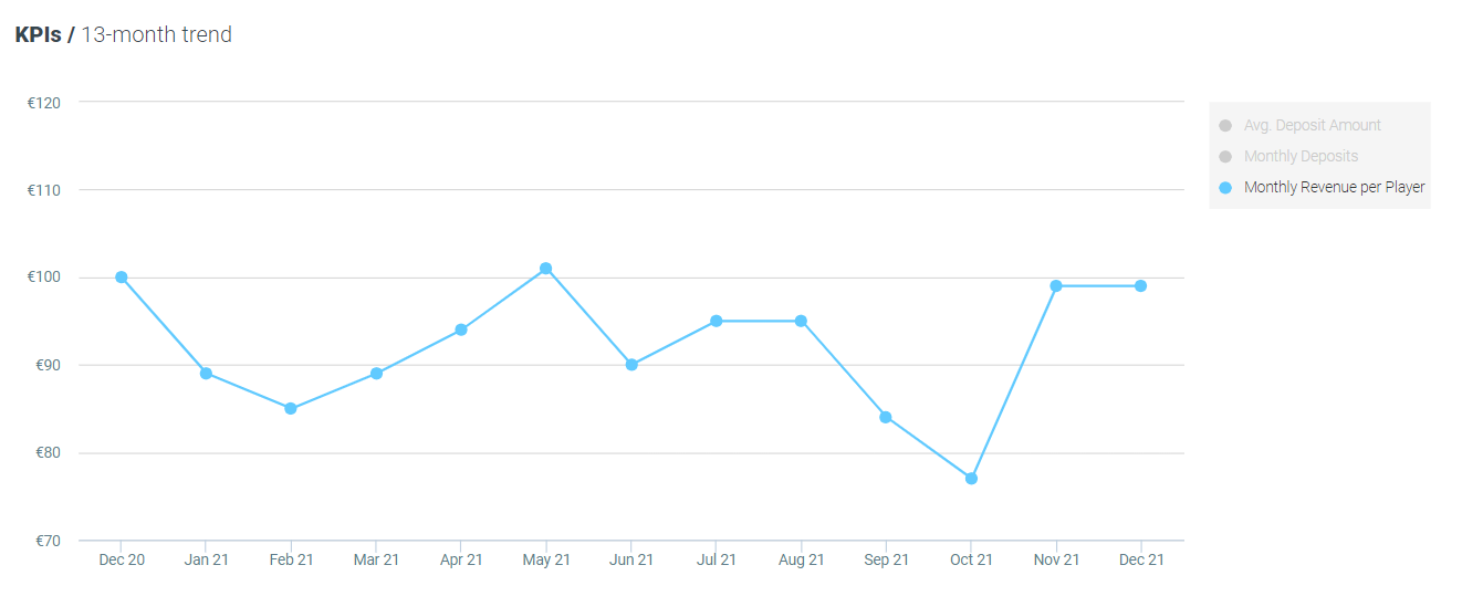 There has been a decrease of 1% MoM in average revenue per active player. It remained static YoY, now standing at €99 per player.