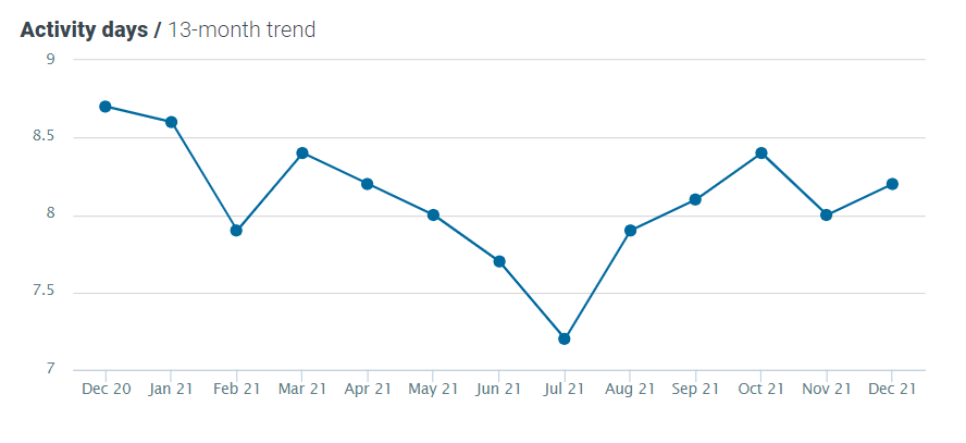 This month, the number of activity days decreased by 6% MoM and increased by 3% YoY, now standing at 8.2.