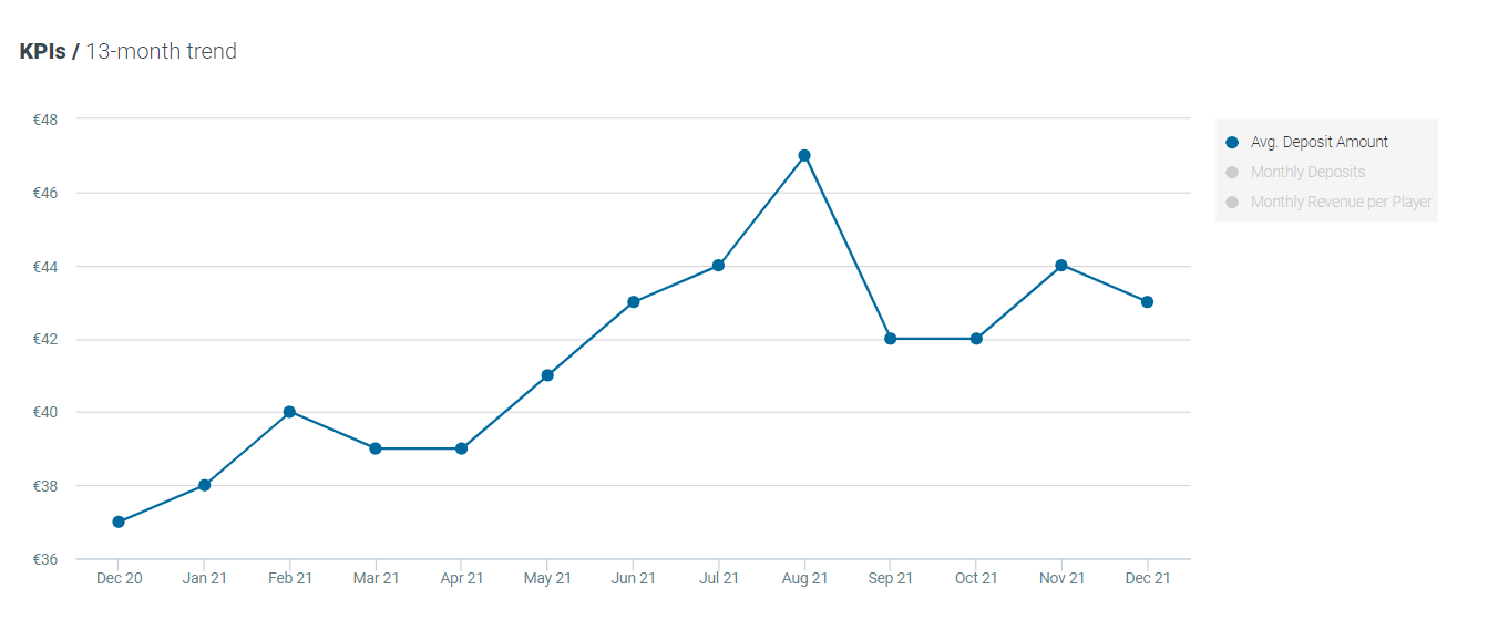 The average deposit amount for casino players remained static MoM and increased by 16% YoY, now standing at €44.