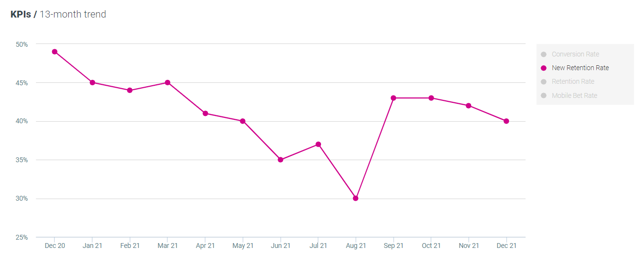 New retention rates have decreased by 18% MoM and by 5% YoY, now standing at 40%.