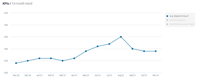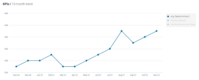 The average deposit amount for casino players increased by 2% MoM and increased by 16% YoY, now standing at €43.