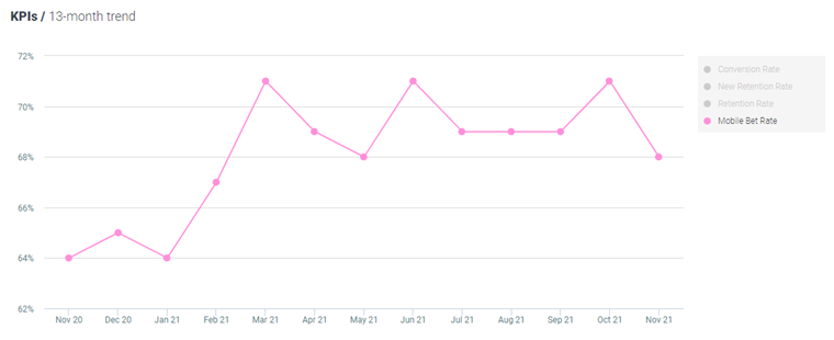 For this report, this KPI is defined as the total mobile bet amount during September, divided by the total bet amount. Looking at the data, the rate remained decreased by 4% MoM and increased by 6% YoY, now standing at 68%.