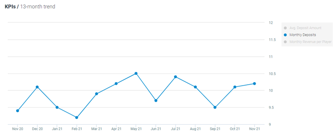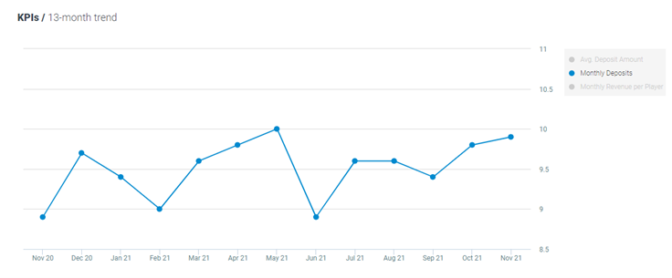 The average number of monthly deposits per player increased by 1% MoM and by 9% YoY, now standing at 10.2 deposits per player.