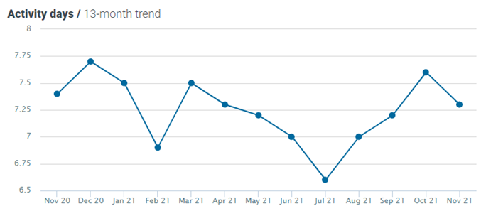 The number of activity days decreased by 4% MoM and by 1% YoY, now standing at 7.3.