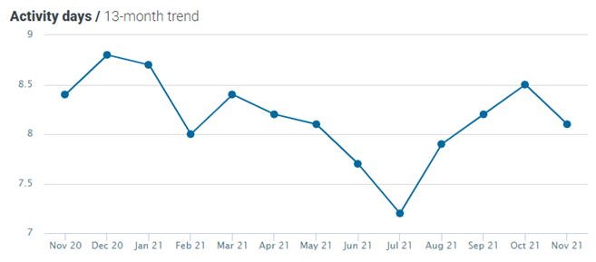 This month, the number of activity days decreased by 5% MoM and by 4% YoY, now standing at 8.1.