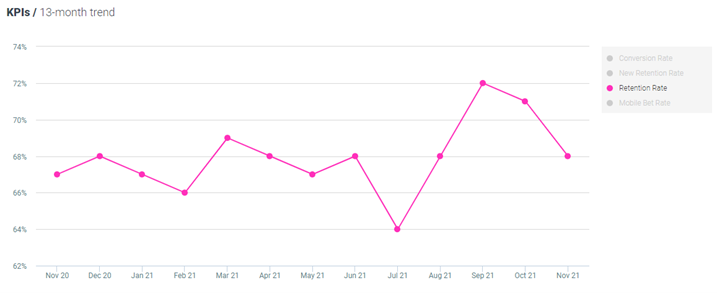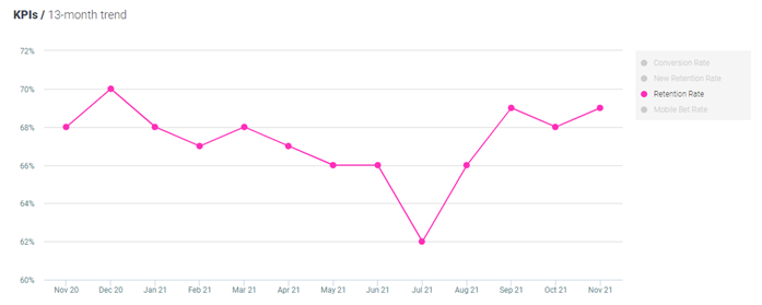 Retention rates for sports bettors have increased by 1% both MoM and YoY, now standing at 69%.