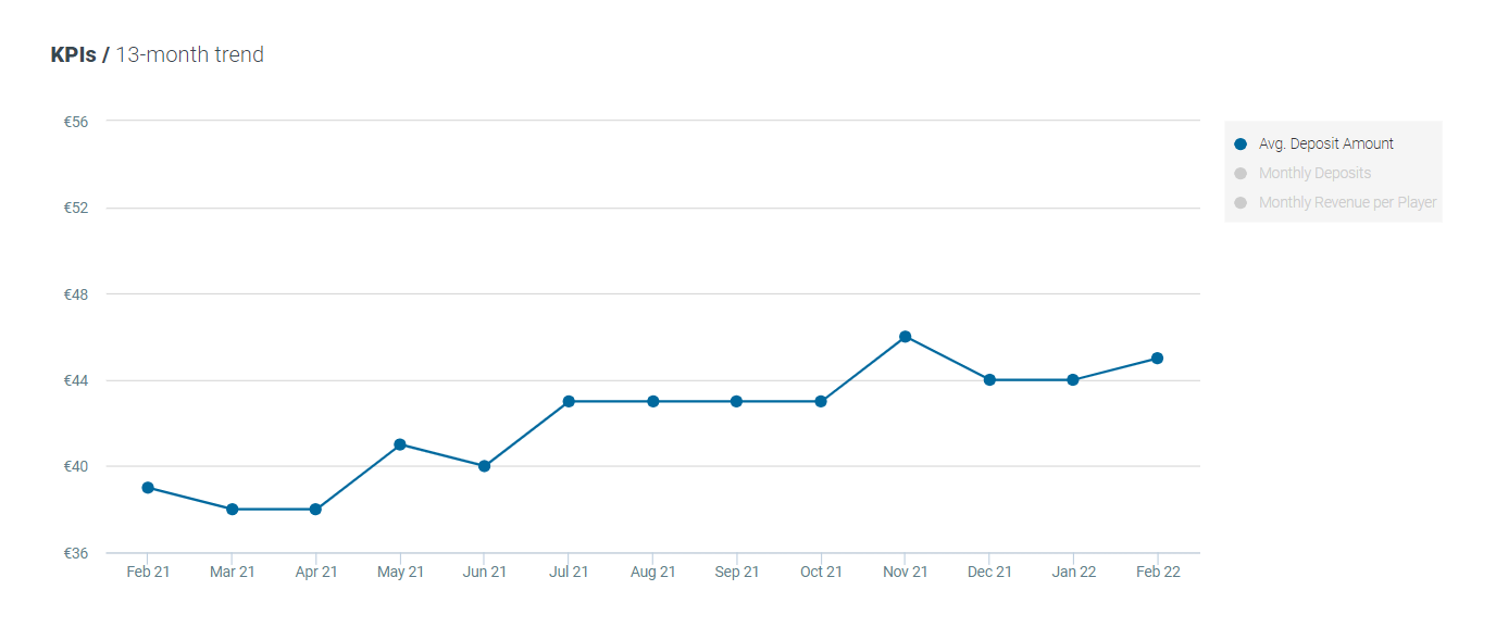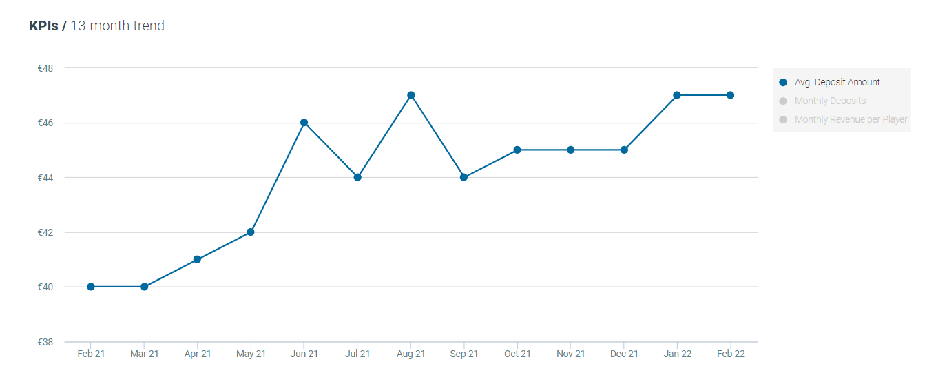 The average deposit amount for casino players decreased by 2% MoM and increased by 15% YoY, now standing at €45.