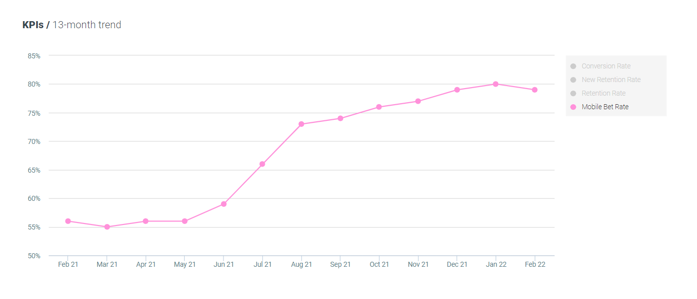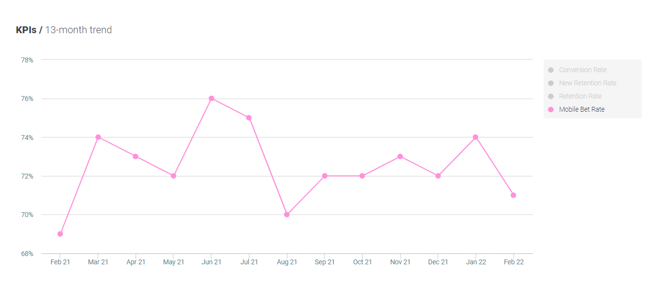 The Covid-19 pandemic is, for all intents and purposes, over. In the UK, that is. How do we know? The government announced the lifting of all restrictions during the month of February, it was all over the news. But that’s not all, we’re looking at the mobile bet rate in the UK and comparing it to February 2021, at the height of lockdown. We’re seeing a whopping 41% increase YoY and back to pre-pandemic levels. Locked in, players ditched mobile betting and changed their go-to betting device. As more restrictions were lifted and outdoor life accepted again, players returned to mobile betting. If our smartphone use is any indication of “normality”, then life in the UK is some 40% more normal than the same time last year.