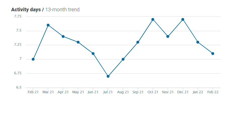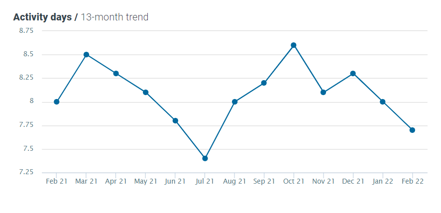 This month, the number of activity days decreased by 4% MoM and YoY, now standing at 7.7.