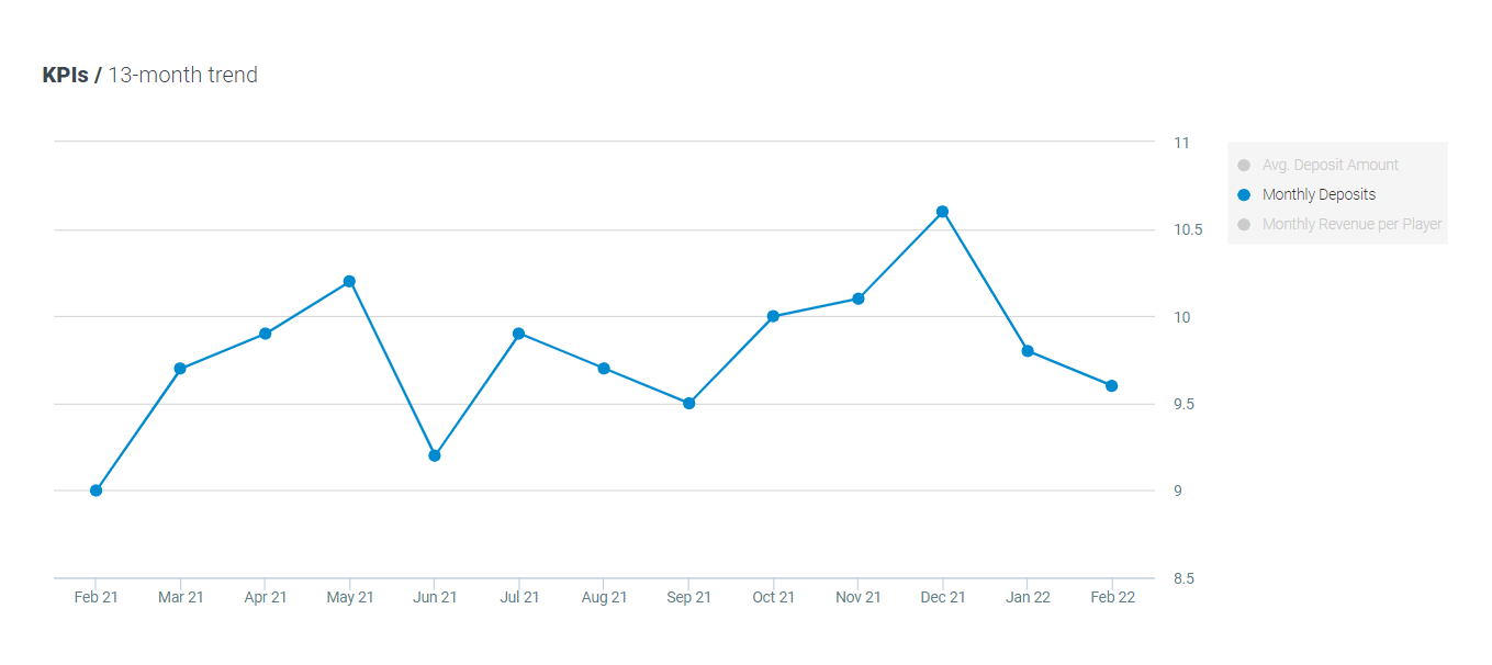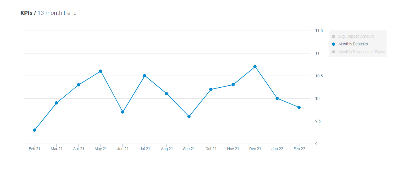 The average number of monthly deposits per player decreased by 2% MoM and increased 5% YoY, now standing at 9.8 deposits per player.
