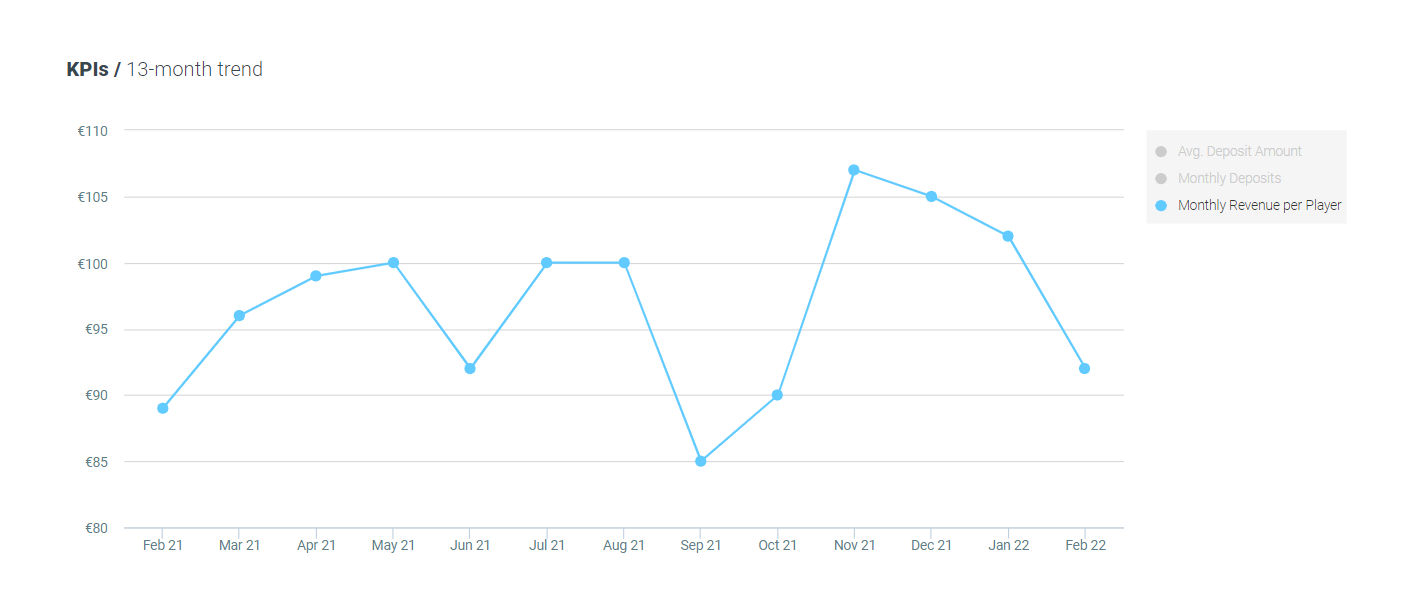 There has been a decrease of 9% MoM in average revenue per active player and no change YoY, now standing at €88 per player.