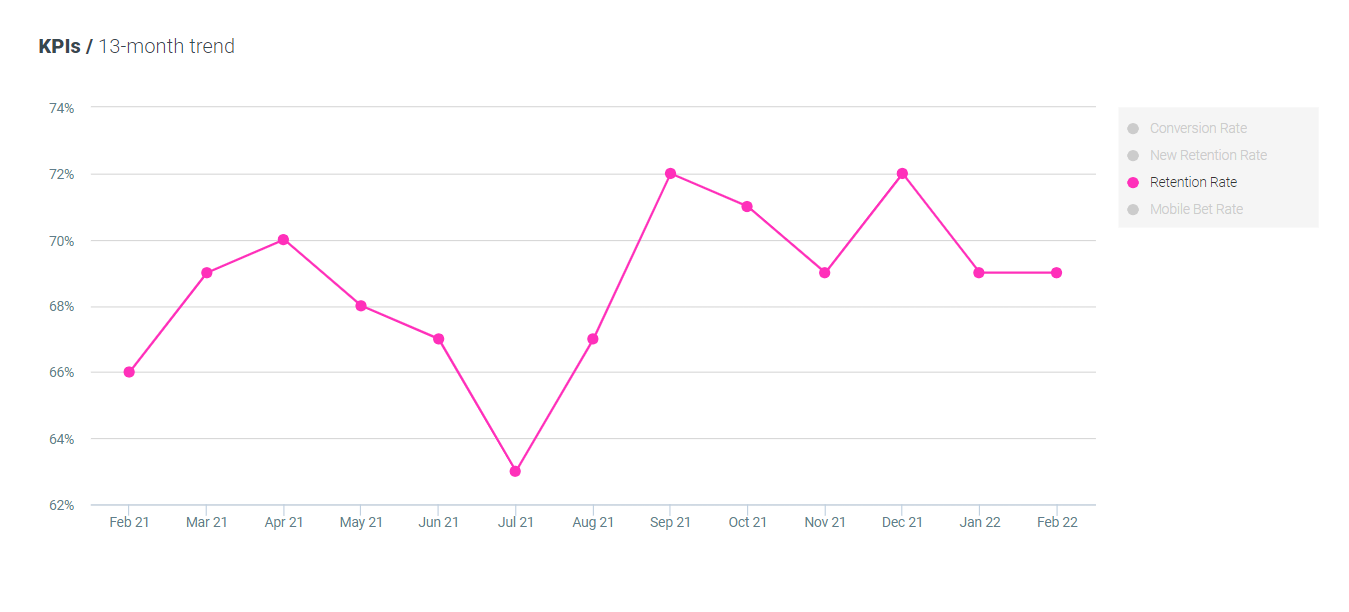 Retention rates for sports bettors have remained static MoM and increased by 5% YoY, now standing at 69%.