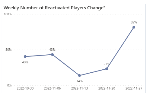 Dormant players join in on the action with a nice uptick of 59% (23% to 82%) in the number of reactivated players (weren’t active last week) globally as the average reactivation rate stands at 3.2%.