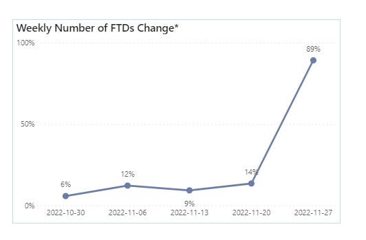 As the action on the pitch kicks up a notch, so does the data on the World Cup Pulse. New players keep coming in large numbers almost across the board. While the overall rate shows 89% (+75% rise), leading all nations are Austria (257%), Belgium (243%), Portugal (214%), Greece (195%), thd US (181%), Spain (149%), Poland, (141%) and Brazil (103%). While other nations made smaller gains in that category, it’s interesting to note that Canada is showing a negative 1% in new player change compared to the June 2022 baseline. See the global chart below:
