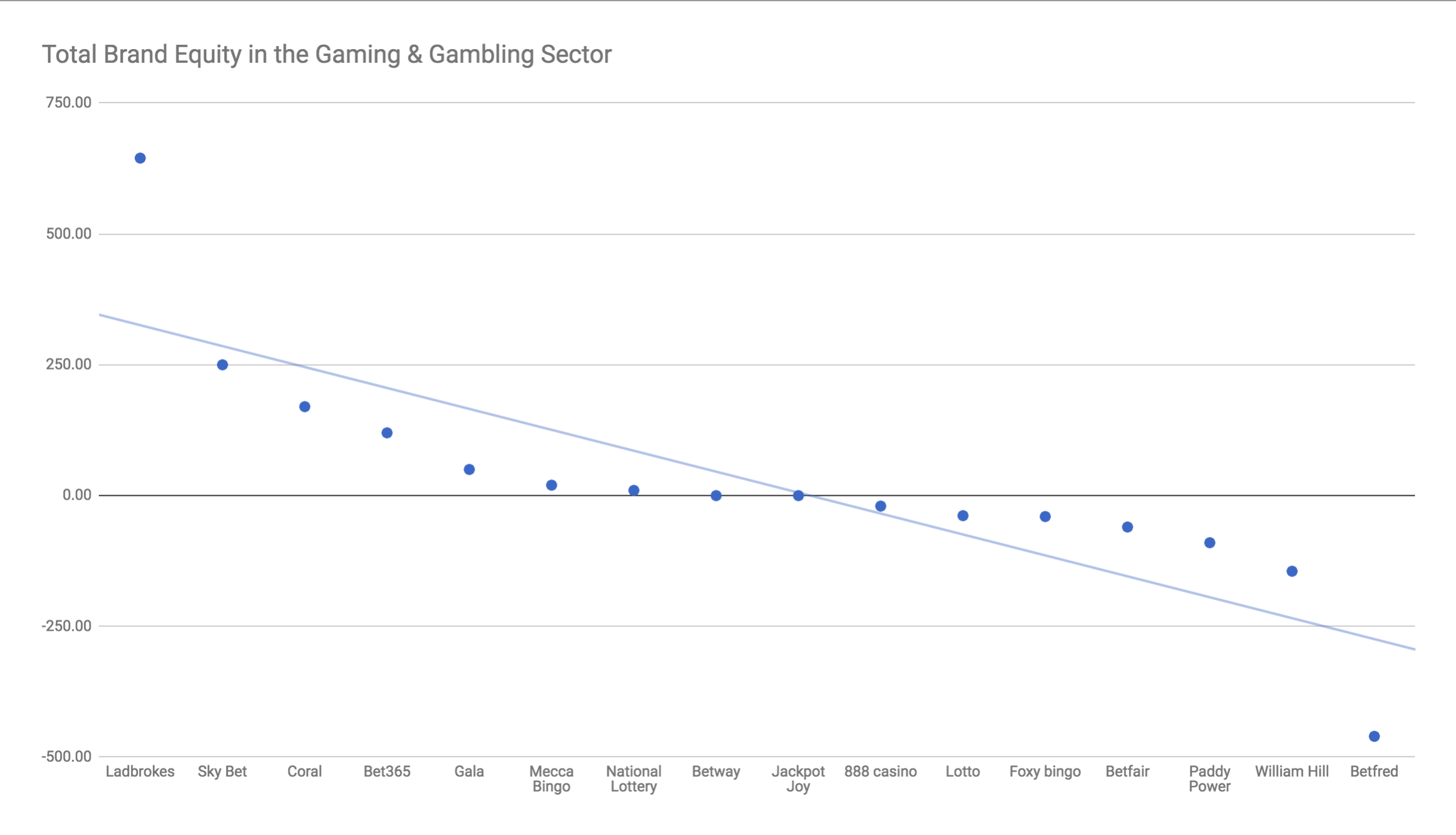The three metrics combine to form a ‘brand equity’ score, which was led far and away by Ladbrokes, with Sky Bet, Coral, bet365 and Gala rounding out the top five.