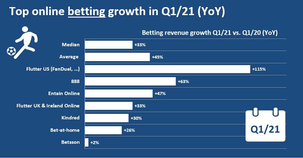 The Online Gambling Quarterly also analysed the development of betting revenue (mostly net revenue) in the recent quarter with the following insights:- Average growth – On average, betting revenue increased in Q1 2021 (compared to a year earlier) by 45% (YoY).