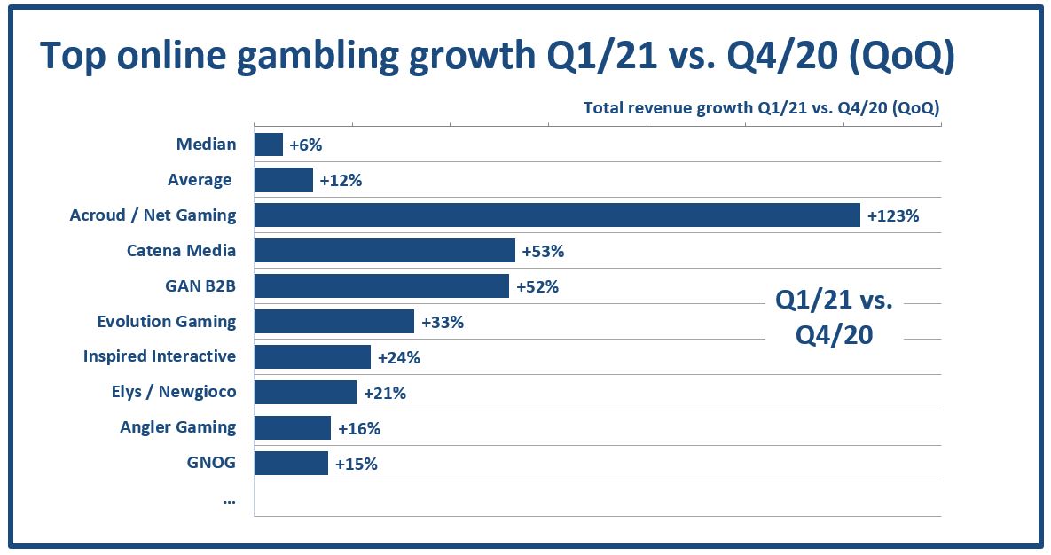 In many cases, the YoY growth rates are exceptionally high due to acquisitions made in a previous quarter – an effect that carries through for consecutive quarters after the acquisition. Therefore, several leading companies in the YoY growth benchmarking have those top positions more or less due to acquisitions made within the 12 months before the analysis. The researchers at Online Gambling Quarterly have therefore decided to also analyse QoQ benchmarks as well. Those growth rates might be impacted by seasonal effects (e.g., football season versus no football season) and other changes, but these figures can provide a quick, current overview of the most recent growth dynamics while excluding effects of acquisitions in previous quarters.- Average growth – On average, revenue grew in Q1 2021 (compared to the previous quarter Q4 2020 – QoQ) by 12%.