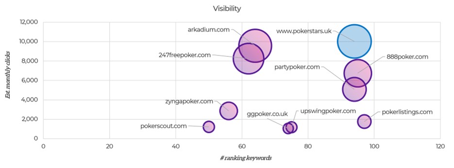 Arkadium is undoubtedly the big winner of the last six months in the poker market as it has seen a 159% increase in traffic to become the second most visible brand. Often, when a brand experiences a traffic increase like this, it can be a result of a sudden improvement in the rankings for one high-volume keyword, which then leaves the brand vulnerable to an equally sudden decrease in traffic if its ranking for that keyword changes again.This doesn’t seem to be the case for Arkadium, though. Solid foundations were already in place in April and improvements have been seen across the board as the brand ranks for eight new keywords, and it has seen its average ranking position improve from 18 to 7. The largest single source of new traffic is the position one ranking for ‘poker games’, which has generated an extra 3,683 clicks, but as this makes up 63% of new traffic, we can see that a considerable number of new clicks are being generated across the board. Strong rankings for ‘poker game’ (8,100 monthly searches) and ‘poker play’ (12,100 monthly searches) have also helped Arkadium’s cause. If the brand keeps heading in this direction, then it’s entirely feasible that it could become the most visible brand in the sector.
