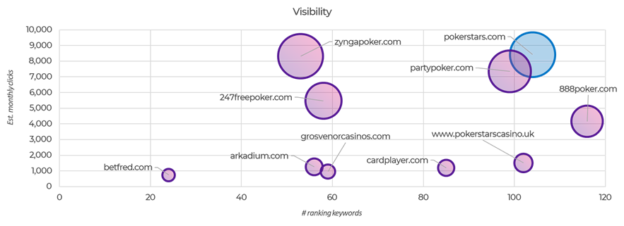 PokerStars sits at the top of the organic non-brand search results in the online poker sector, marginally ahead of the free-to-play Zynga Poker, despite a 34% reduction in traffic with a visibility of 8,419.