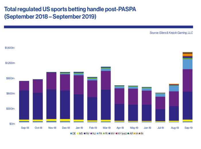 The regulated US sports betting market generated handle of $1.34bn for the month of September, which was up 78.19% on August’s total of $753.03m.