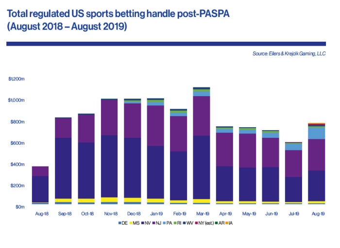 The regulated US sports betting market generated handle of $758.7m for the month of August, which was up 30.7% on July’s total of $580.4m. The significant month-on-month increase was mainly attributable to two factors.