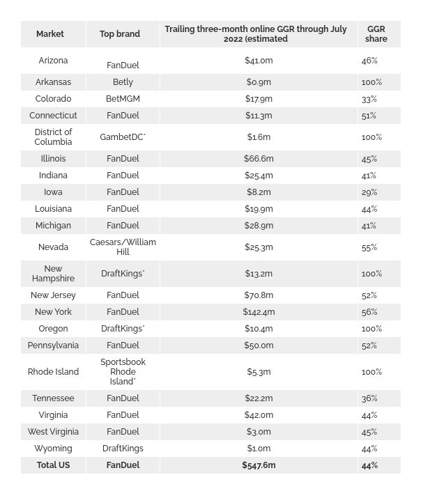 In the table, we show our proprietary estimates of US online sports betting gross gaming revenue (GGR) on a by-brand, by-state basis in the three-month period through July 2022.FanDuel continues winning the biggest markets, which is helping it to win the national market. Indeed, the Flutter-owned brand currently has 44% national GGR share, according to our tracking. New York, where FanDuel captured an eye-catching 56% OSB GGR share during the May-July period, is currently the brand’s largest single market — and by some distance.
